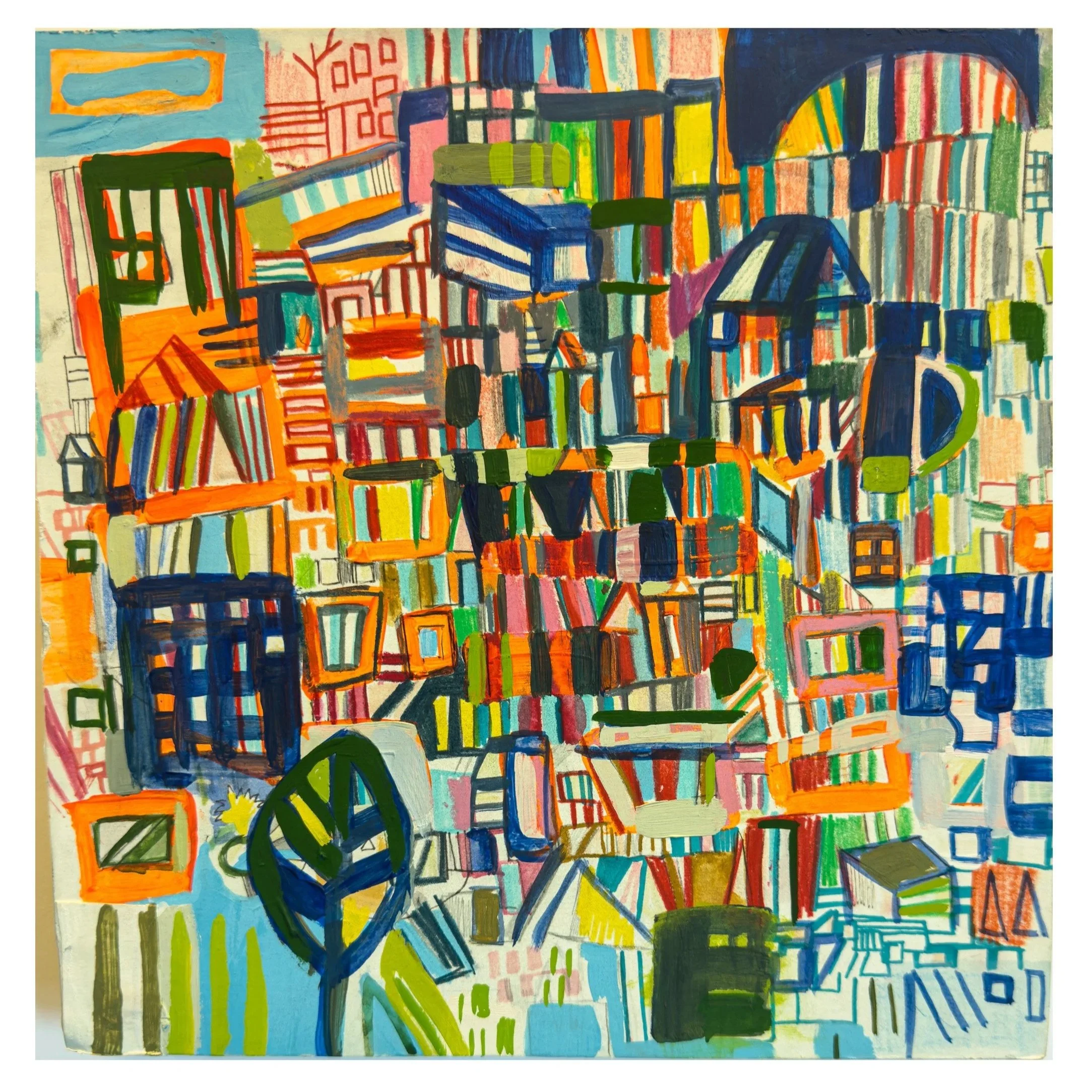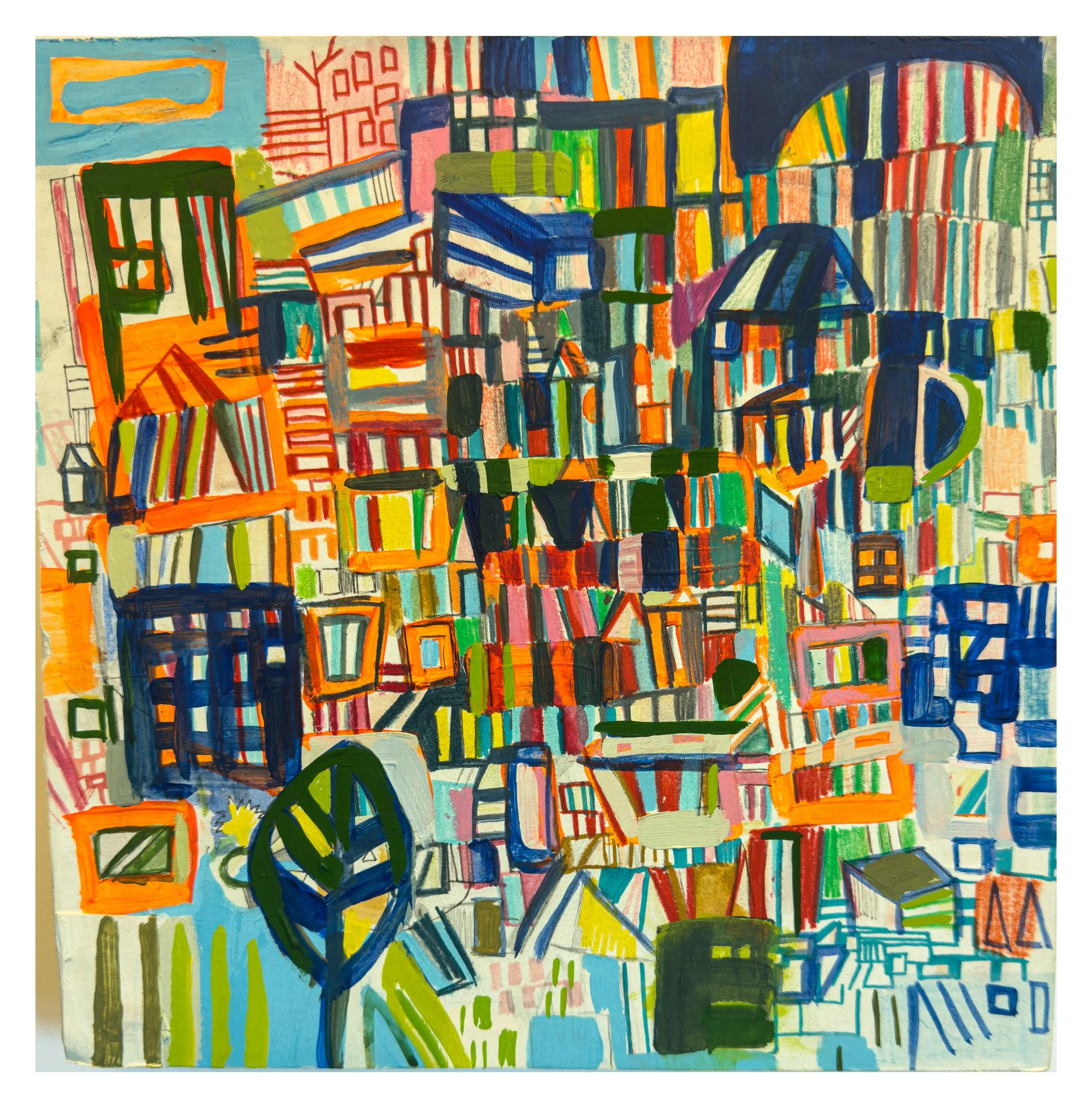 This work is part drawing, part daydream, part uncertain architecture. A cityscape on the edge of something larger. It could be ocean, memory, a machine. Bits of orange act as signals or caution, while dark blues and reds build layered routes through the composition. The panel’s surface is a place where thought and time loop and repeat.