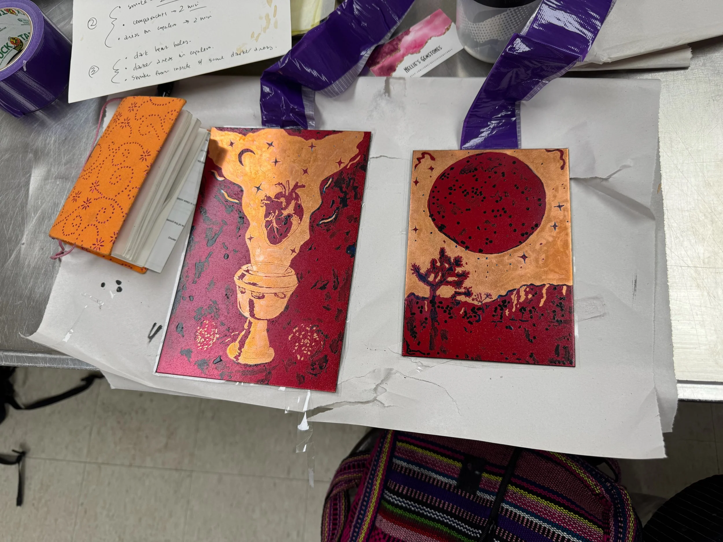 copper plate etching prep work. Student work by Jeannine Cicco Barker. This is an example of work you can do in Printmaking on the press: Intaglio.